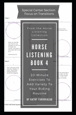 In this fourth book of the Horse Listening Collection, Kathy Farrokhzad has compiled all the best patterns and exercises that people have raved about each time they’ve been featured on the blog and on social media. Three years have passed since the last Horse Listening Book 3 compilation. As you can imagine, there is a LOT of material to choose from, and this book has been distilled down to only the best and most widely read and commented on posts.The book is divided into five sections: Warm-Ups, Left and Right, Straightness, Suppleness and Collection. But there’s more There is a Special Center Section dedicated to only Transitions – something that we can all work on throughout our riding careers. And finally, scattered throughout the book are chapters that clearly explain theory, technique and skills that can help improve the featured exercises of teach Section.This book will give you practical, take-to-the-barn-ready exercises and patterns, plus all the in-between knowledge you need that will help you improve specific skills – all for the sake of your horse